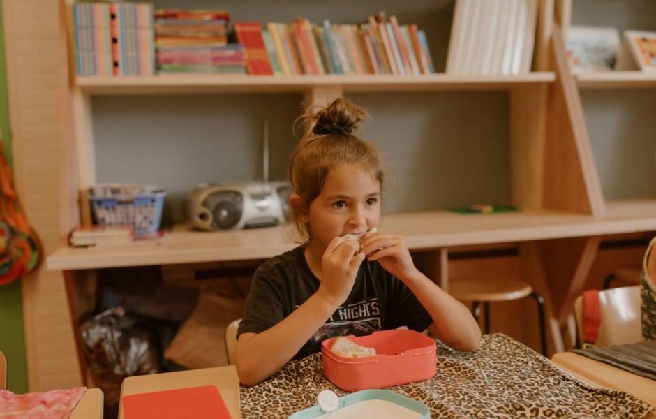 Tussen de middag eten we in de klas en daarna gaan we een half uur naar buiten.